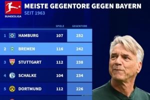 在德甲面对拜仁丢球数前10球队:汉堡交手107次丢252球排名第一